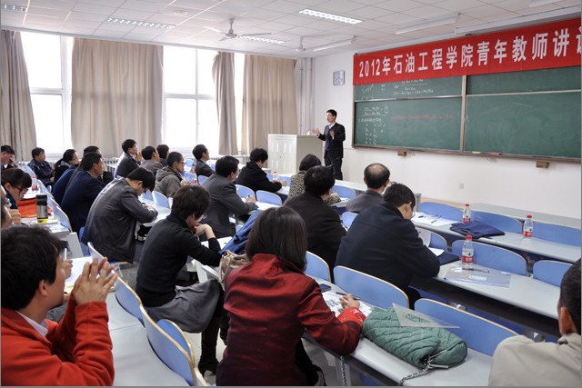本次比賽與往屆不同的是參賽教師在比賽現場從備選的五個講課片段裏麵隨機抽取其中一段講課內容,全程使用板書為大家進行講解。教師們一個個精神飽滿,準備充分,講課內容圖文並茂,形象生動。課堂中還不時穿插聯係著一些與生產實際相結合的例子,使得現場氣氛異常活躍。經過激烈的角逐,最終采油工程係吳飛鵬老師摘得一等獎,二等獎分別由油藏工程係的楊永飛、油田化學係的曹傑、範海明3位老師獲得。