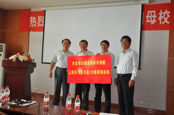 10月2日,鑽井78級的校友從德州出發齊聚我校,在學院大廳舉行了畢業三十周年聚會活動,並向學院捐贈“981海洋鑽井平台模型”,中石油副總經理汪東進在代表校友們感謝母校母院的培養,並對近年來學院所取得的成績表示由衷的祝賀,無論校友們身在何處都將時刻關心、大力支持學院的發展。10月4日開發82級校友在學院報告廳舉行座談會,共敘同學情誼,表達對學院的關心與支持,捐贈10萬元及雙驢頭、寬帶式抽油機各一台。