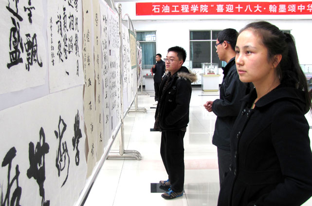 11月5日,由院黨委主辦,院工會、院團委承辦的“喜迎十八大•翰墨頌中華”師生書畫展在工科樓B座大廳舉辦。除全院教職工、大學生的作品外,本次書畫展特邀山東省書協會員、中華民族書畫家協會常務理事、黃島書畫院副院長王功世,東營市書法家協會會員、文學院楊景亮教師,儲建學院李心市老師等作品參展。