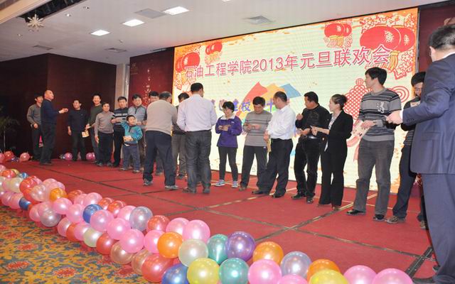 隨後,教職工們表演了形式多樣、豐富多彩的文藝節目。在舒緩流暢的音樂裏,油藏工程係教師們衣著華麗的民族特色服裝,以開場舞《好日子》歡慶新年,帶來喜悅與美好的祝福;歌曲串燒之後,歌伴舞《東北家人》獨特的唱腔,精湛的表演讓人彷佛置身於靜謐的鄉野之中;風采青春,魅力舞台,由團委表演的《江南Ssyle》熱情奔放,活力四射,博得滿堂彩;三句半《一年四季》、木偶劇《雙簧舞蹈》、呂劇《馬大寶喝醉了酒》等節目精彩紛呈,絢爛奪目;趣味遊戲中,姚軍、李愛芬等三對夫婦獲得最有默契獎,現場觀眾報以熱烈的掌聲。歌曲《一杯美酒》唯美動聽,真切動人;石工藝術團現場助興,帶來精彩的舞蹈《山鷹之邦》慷慨激越,樂觀向上;歌伴舞《讓我們舞起來》大氣喜慶,最後將現場氣氛推向高潮。聯歡會進行過程中,還穿插了元旦“大樂透”抽獎環節,讓現場觀眾驚喜連連。