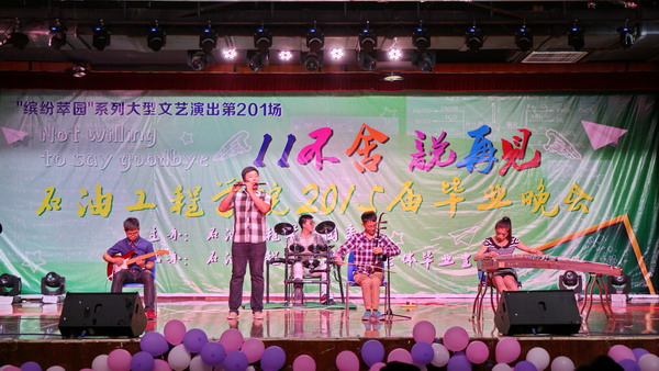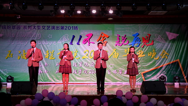 晚會在熟悉的上課鈴聲中拉開帷幕。黑板形式的幕布、課本形式的節目單、班委們幽默輕鬆的主持風格,將大家帶回了滿載我們青春回憶的課堂。整場“班會”以“11不舍 說再見”為主題,分為“青春季 雲帆揚”、“千山過 情悠長”和“意難忘 訴離傷”三個篇章。舞台上,以班級為單位的各“小組”成員用舞姿、用歌聲回憶了大學的美好時光,展現了青春的積極昂揚;舞台下,同學們紛紛發送微信上牆,或訴說難舍之情,或傳遞臨別祝福,或表達感恩之心,或調侃“班會”趣事。晚會現場,歌聲、笑聲、呐喊聲聲聲交織,友情、愛情、師生情情情動人。